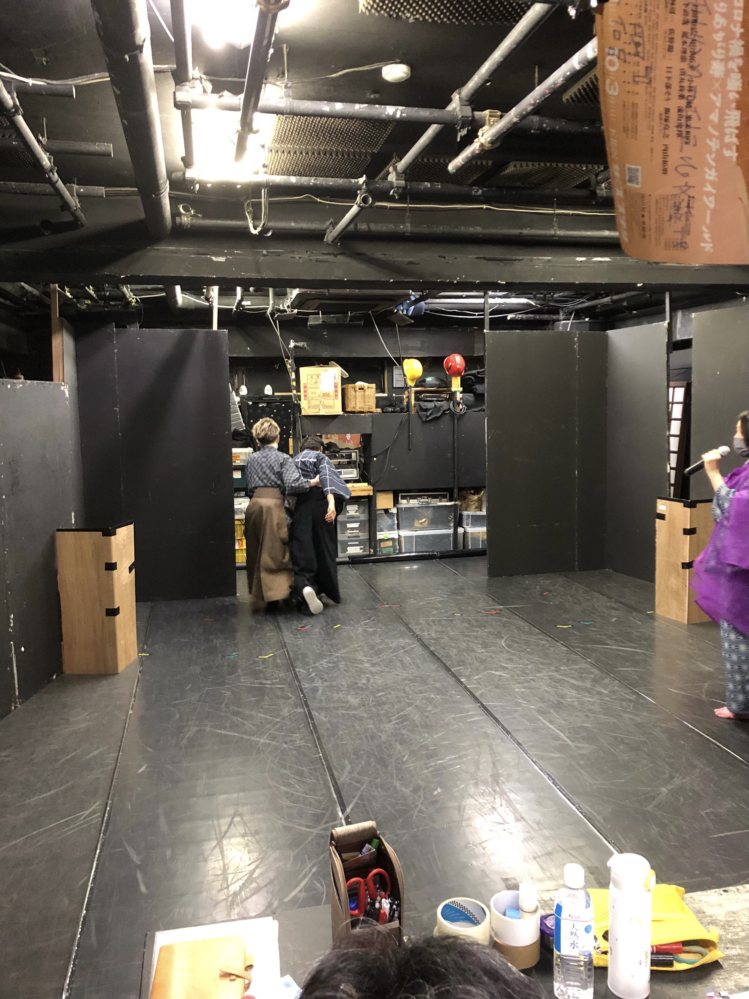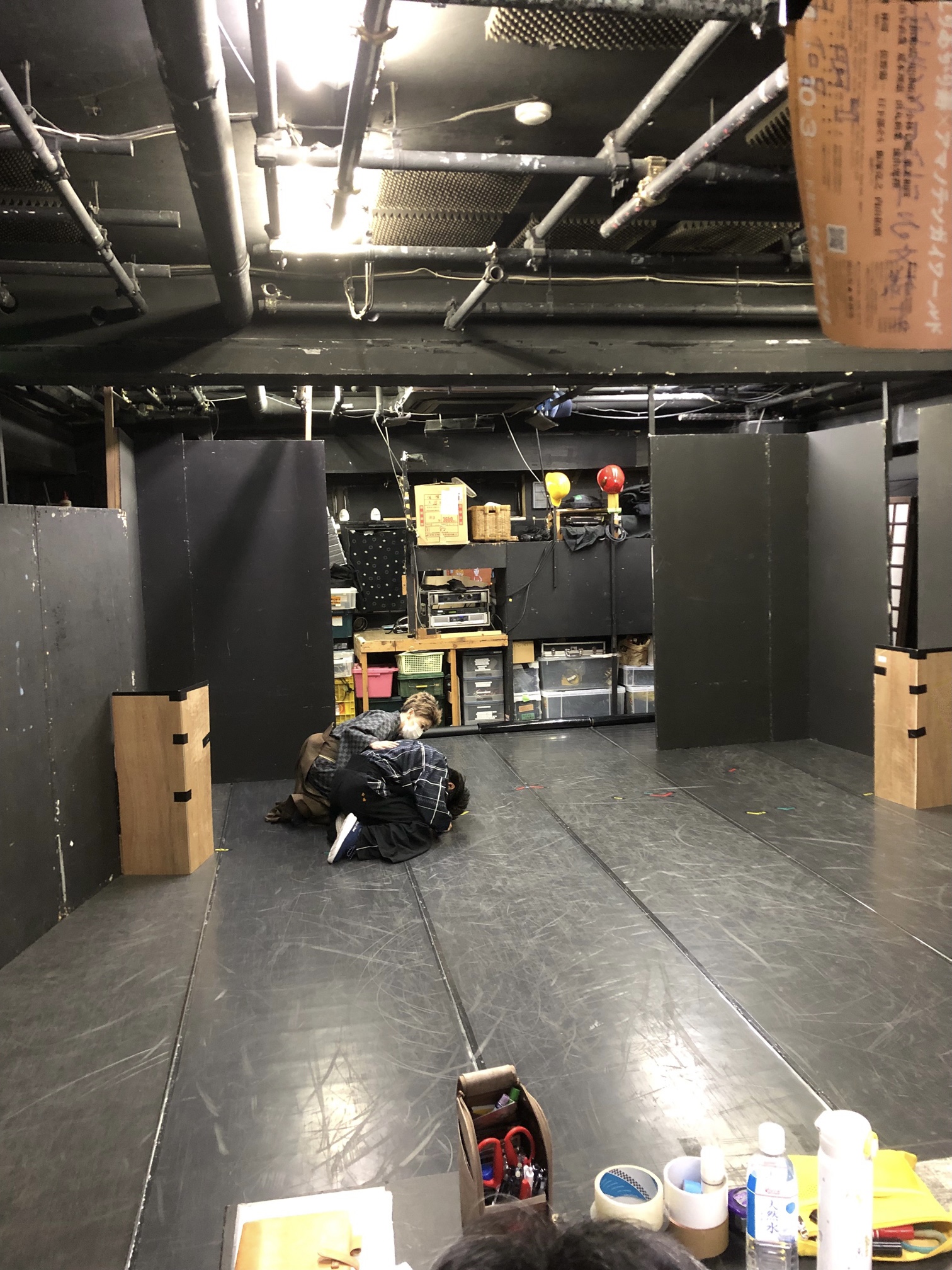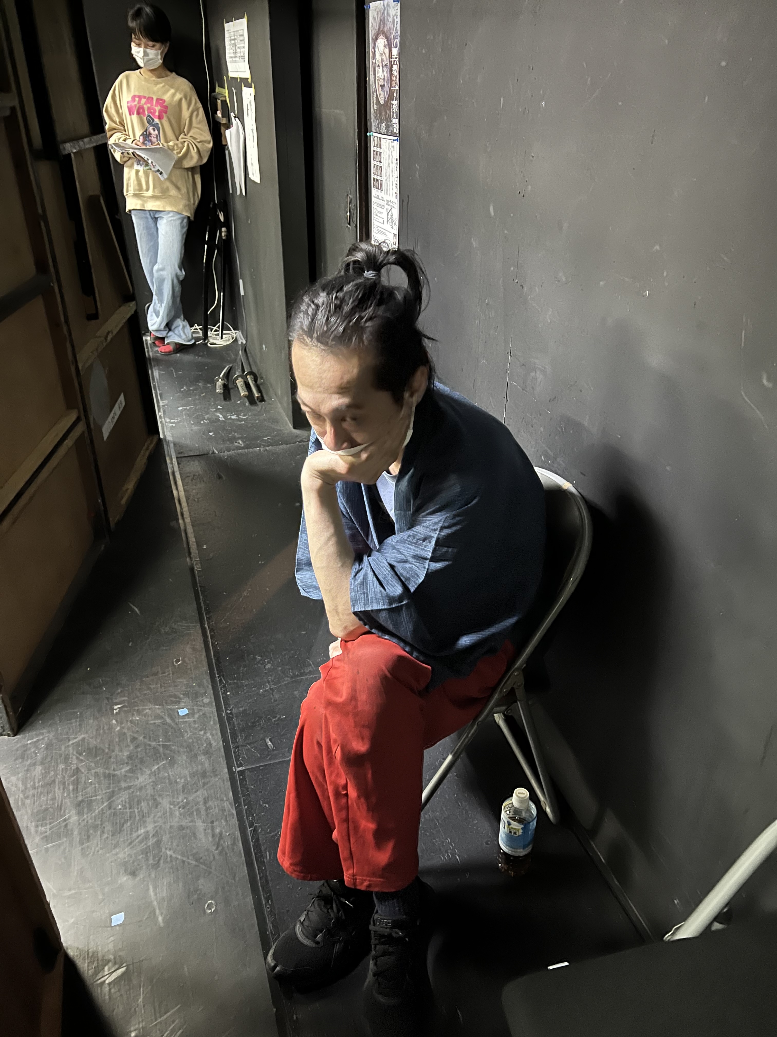 2時間近く舞台セットの壁を支え続ける、壁男。(左奥)