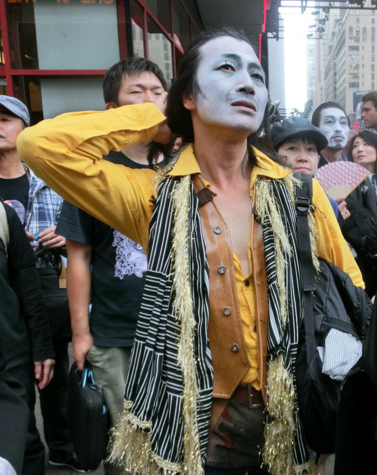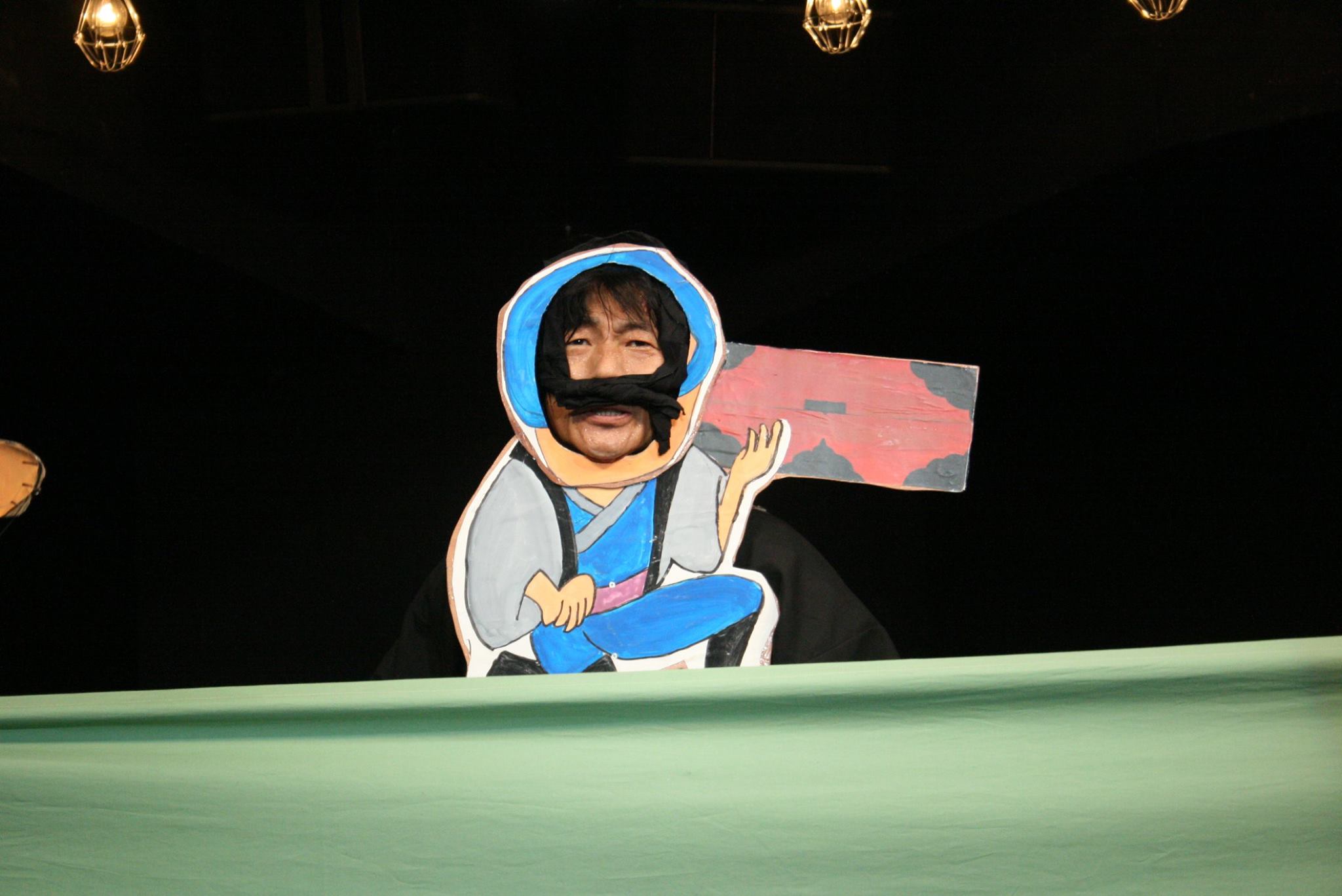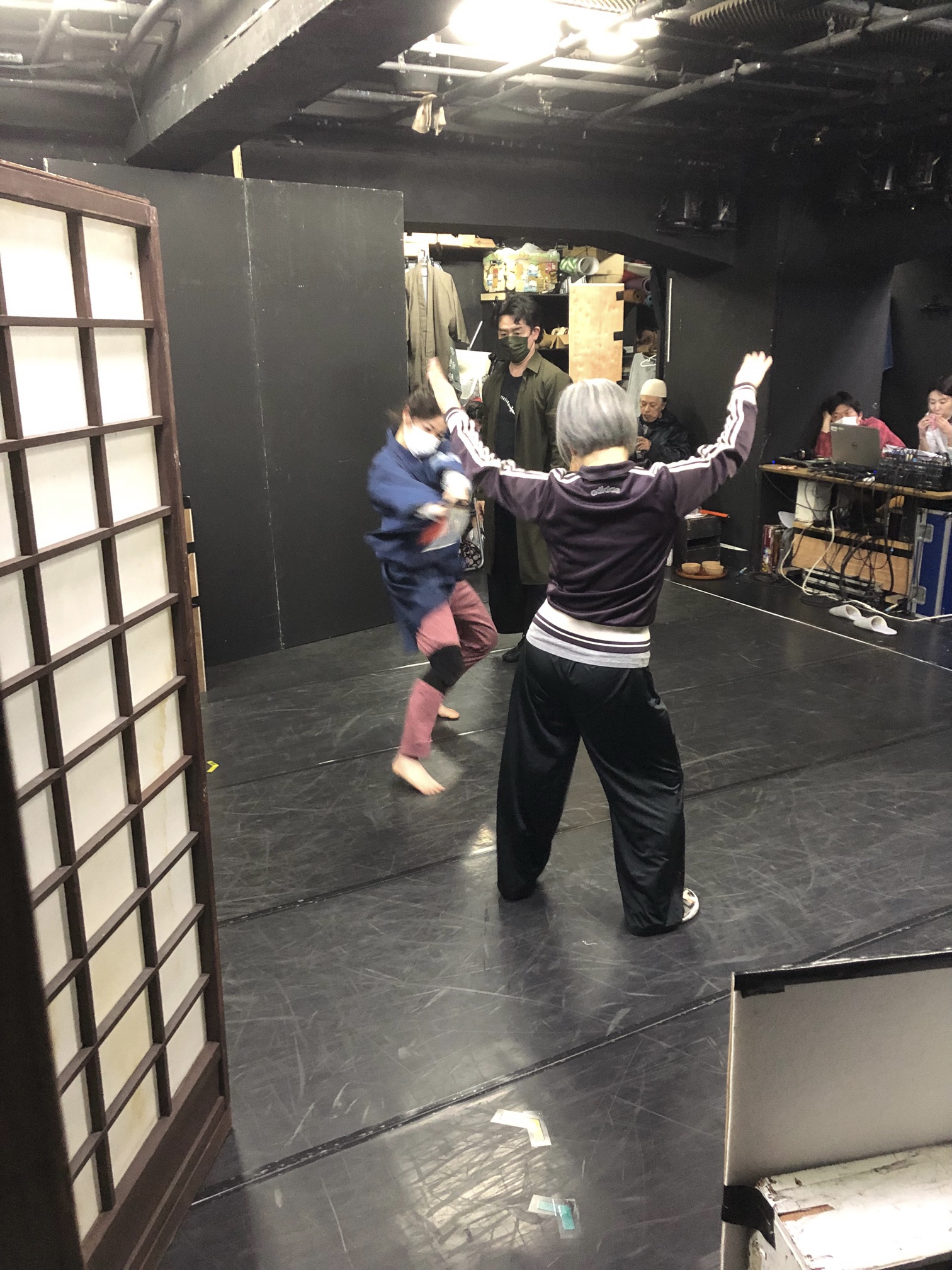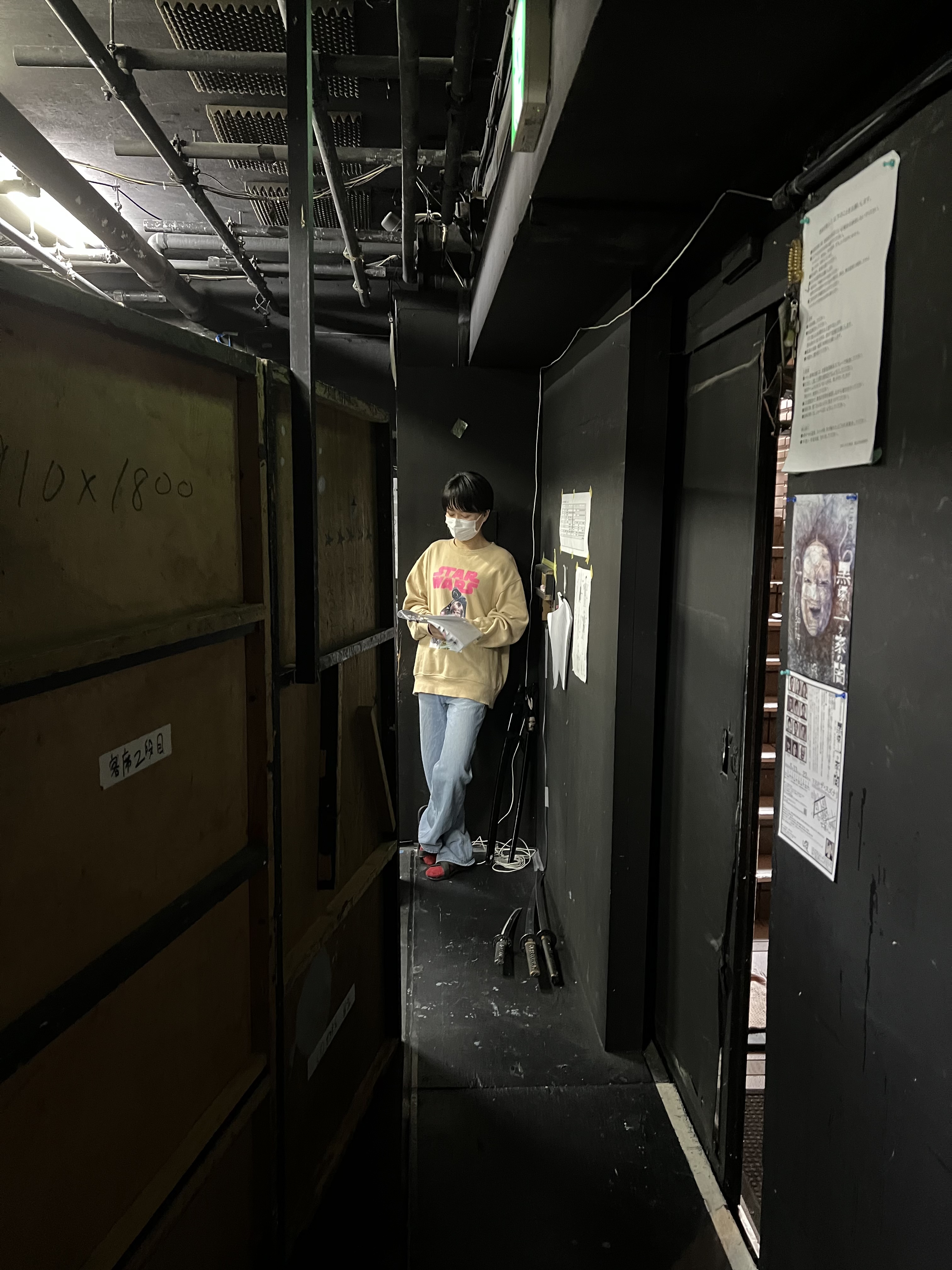 2時間近く舞台セットの壁を支え続ける、壁男。(左奥)