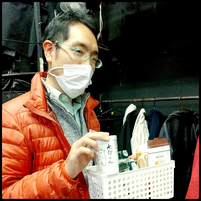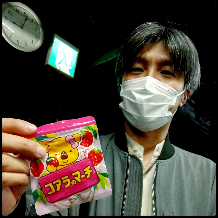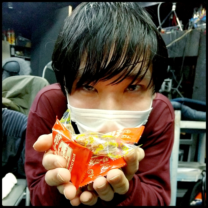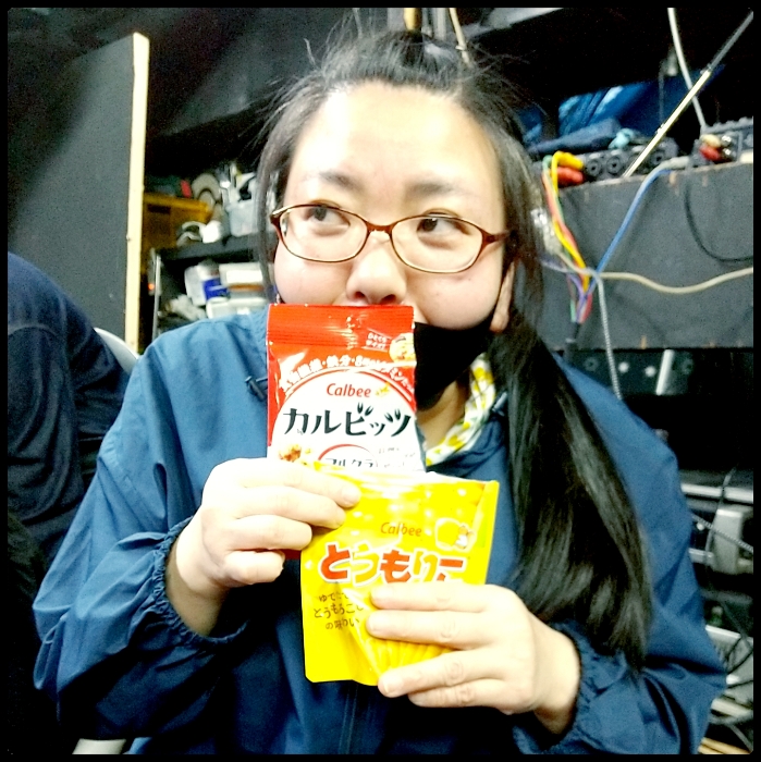 照明の横原由祐さんにおやつ見せてと頼んだら、コンタクトのケースとか洗浄液とかが入ったビニールのポーチから、コアラのマーチが出てきました。なんでそんなとこに。