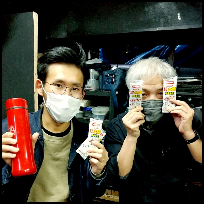 群馬に行ったわけでもないのに群馬限定のばかうけを大量に差し入れしてくださったのは、ハマジこと浜嶋将裕さん(映像)。そして左にいるのは、お弟子さんの宇野雷蔵さん。名前かっこよすぎ。