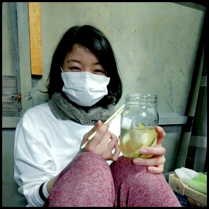 稽古場のすみっこで自家製ピクルスをつついていたのは丸子さん。おしゃれだし、ヘルシーだし、美味しそうだし。真似しようかな。