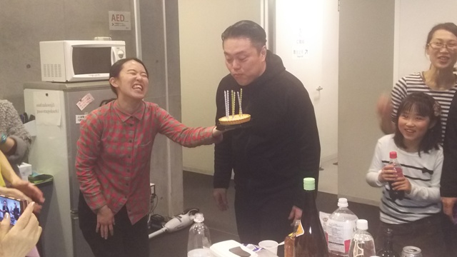 この日は坪田英次郎役の拓平さんのお誕生日だったので祝いを…。エアーろうそく消しでした。